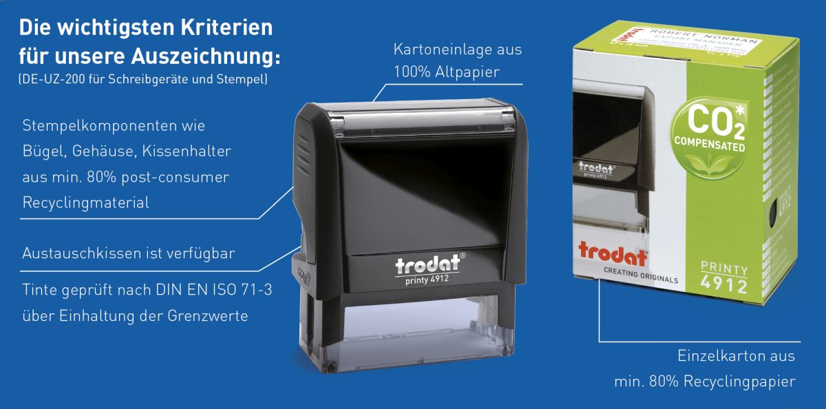 Als 1. Stempelhersteller haben wir Mitte Oktober das in Europa bekannte und wichtige Umweltzeichen “Blauer Engel” für die Original Trodat Printy 4.0 Modelle 4910, 4911, 4912, 4913, 4914, 4915 (eco-schwarz und eco-grau mit schwarzem Kissen) erlangt!