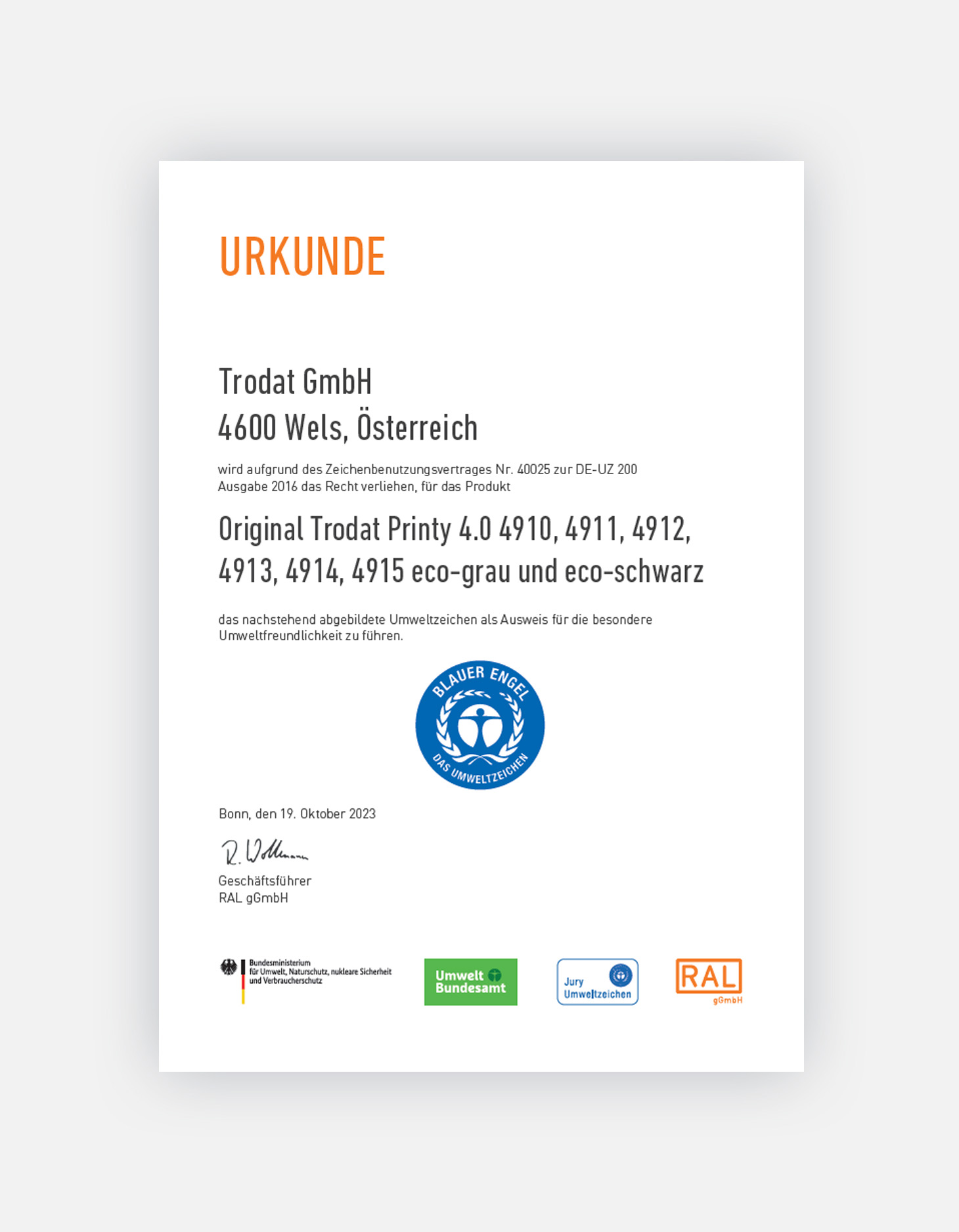 Als 1. Stempelhersteller haben wir Mitte Oktober das in Europa bekannte und wichtige Umweltzeichen “Blauer Engel” für die Original Trodat Printy 4.0 Modelle 4910, 4911, 4912, 4913, 4914, 4915 (eco-schwarz und eco-grau mit schwarzem Kissen) erlangt!
